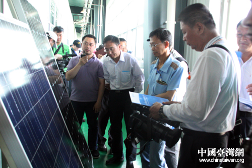 在酒泉新能源裝備制造產業園區,東汽投資發展有限公司工作人員在向臺灣媒體記者詳細介紹太陽能電池的生產和利用情況。(中國臺灣網 郜利敏 攝)