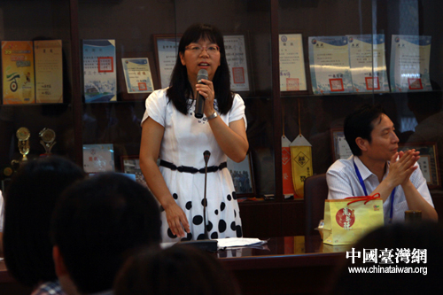 座談會上,臺中市大墩小學校長謝秀娟為大家介紹學校的整體情況、課程設(shè)置以及辦學理念。(中國臺灣網(wǎng) 李丹 攝)