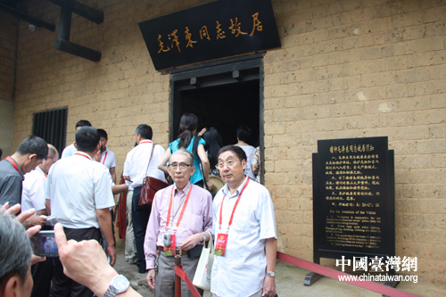 參訪團(tuán)成員在毛澤東故居前合影留念。(中國(guó)臺(tái)灣網(wǎng) 王君飛 攝)