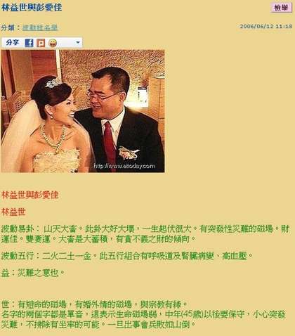昵稱悲憨居士的網(wǎng)友在部落格中分析姓名,網(wǎng)頁出版時(shí)間為2006年6月12日,他以林益世和彭愛佳的名字進(jìn)行分析,寫到林益世屬“山天大畜”卦,此卦大好大壞,一生起伏很大。有突發(fā)性災(zāi)難的磁場(chǎng),有貪不義之財(cái)?shù)膬A向。