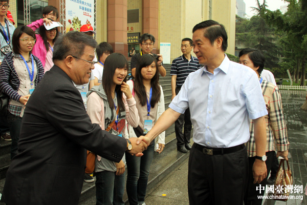 應(yīng)中共四川省委書記劉奇葆邀請(qǐng),臺(tái)灣云林縣、南投縣和彰化縣的105名師生,由臺(tái)灣民意代表馬文君、王惠美帶隊(duì),赴四川參加第三屆“臺(tái)灣學(xué)生天府夏令營(yíng)”活動(dòng)。圖為劉奇葆與臺(tái)灣師生親切握手。(中國(guó)臺(tái)灣網(wǎng) 王偉 攝)
