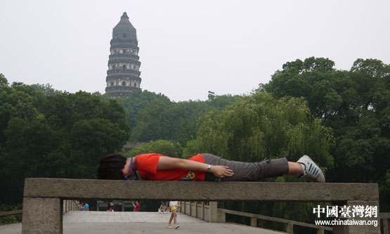 組長張壹翔為組員董柏廷拍照。(中國臺灣網 李丹 攝)