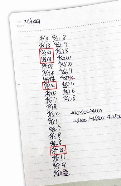 警方查扣少女的筆記本,里面記載接客日期與次數,以今年4月為例,單日接客多達14人(紅框處)。