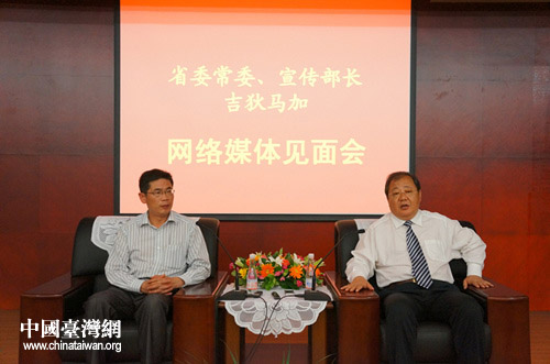 青海省常委、宣傳部長吉狄馬加(右)召開全國重點網(wǎng)絡(luò)媒體見面會。(中國臺灣網(wǎng) 羅旭婷 攝)