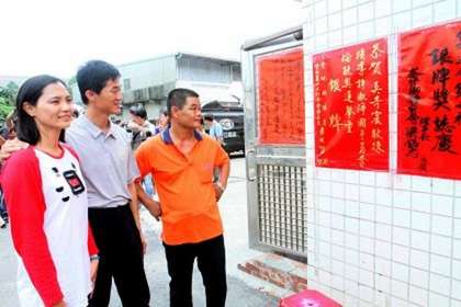 奧運舉重銀牌得主許淑凈家中貼滿祝賀的紅榜,許爸爸(右一)與啟蒙教練吳奇宸(左一)高興看著紅榜。來源:臺灣媒體