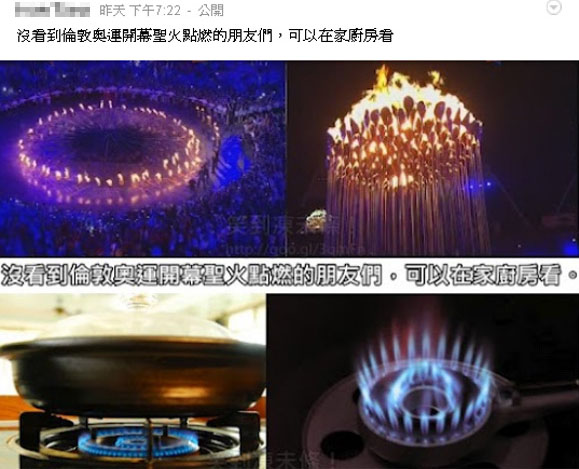 臺灣網友制作Kuso(惡搞)圖片:沒看到圣火點燃的朋友們,可以在家里廚房看看,只要把瓦斯爐火打開就很像了。 圖片來源于網絡