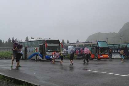 豐濱鄉東海岸石梯坪風景區風強雨驟,大陸客持傘當盾牌,逆風觀浪。圖片來自臺媒