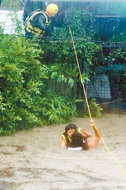 救命索 烏來(lái)屈尺的一間河畔民宿遭大水淹至1層樓高,消防隊(duì)獲報(bào)后到場(chǎng)架設(shè)繩索救援,順利將民眾救出。來(lái)源:臺(tái)灣《中國(guó)時(shí)報(bào)》