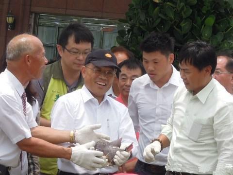 蘇貞昌上午前往一家臺灣鯛魚養殖場,工作人員拿起網子往養殖池里拋下,再請蘇貞昌收網。當網子往池邊拉上來,蘇貞昌露出喜悅的笑容,他稍蹲下身看魚,結果被魚跳噴了一身泥巴。