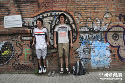 臺(tái)灣學(xué)子在798搞怪留念。(中國(guó)臺(tái)灣網(wǎng) 吳曉寒 攝)