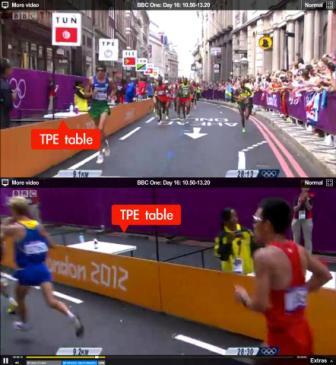 有眼尖網(wǎng)友截取轉播狀況圖片說明,奧運會馬拉松選手場邊皆有志工為選手遞水,唯獨中華臺北隊的桌子是空的。這張圖片在臉書上被瘋狂傳閱,宅神朱學恒戲稱應擺上“快逃啊”的字卡,讓張嘉哲能跑快一點。
