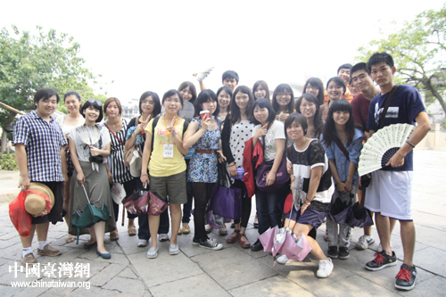 8月13日,由宋慶齡基金會和臺灣“十大杰出青年基金會”共同組織的“臺灣青年學生交流團”一行游覽蘇州,圖為團員在同里古鎮合影留念。(中國臺灣網 孟雅詩 攝)