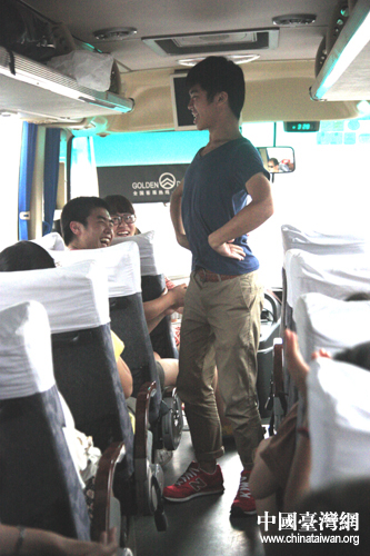 前往蘇州的路上,來自臺北教育大學的陳昱達在車上表演舞蹈。(中國臺灣網 孟雅詩 攝)