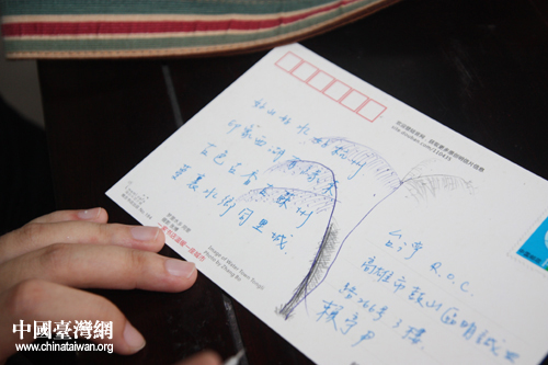 來自臺灣東吳大學的賴亭尹在景區購買明信片后即興賦詩一首,寫上地址,準備立刻寄給臺灣的朋友。(中國臺灣網 孟雅詩 攝)