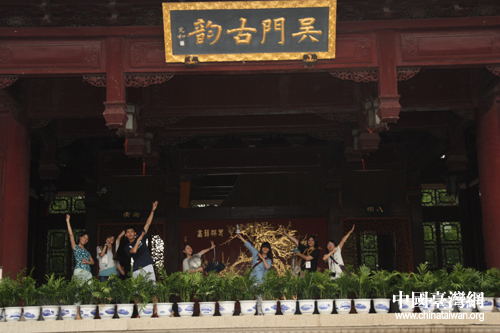 楓橋景區的昆曲戲臺,團員們各種姿勢盡情賣萌。(中國臺灣網 孟雅詩 攝)