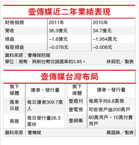 臺(tái)灣媒體業(yè)務(wù)占壹傳媒總營(yíng)收的43.2%,香港占55.3%。在臺(tái)媒體虧損持續(xù)擴(kuò)大是壹傳媒出售的主因,尤其壹電視虧損最為驚人。根據(jù)壹傳媒今年6月公布的年報(bào)顯示,至今年3月底,壹電視過(guò)去一年來(lái)虧損高達(dá)港幣11.7億元(約新臺(tái)幣45億元),吃掉集團(tuán)其他媒體的獲利,導(dǎo)致壹傳媒由盈轉(zhuǎn)虧,全年虧損港幣1.8億元(約新臺(tái)幣6.9億元);相較前一年港幣1950萬(wàn)元虧損,虧損額暴增近10倍,這也是壹傳媒連續(xù)第二年虧損。