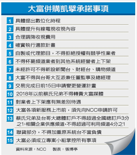 魏學(xué)文表示,按照大富并購(gòu)案的承諾,大富媒體在3年內(nèi)不得申設(shè)新聞臺(tái)與財(cái)經(jīng)臺(tái),3年后如果要申設(shè),也必須送進(jìn)臺(tái)灣“通訊傳播委員會(huì)”審議。