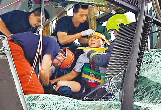 大客車司機被卡在駕駛座上,表情痛苦,警消人員急忙將司機救出送醫(yī)。(圖片來自臺媒)