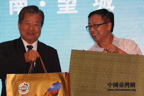 中國旅游協(xié)會休閑農(nóng)業(yè)與鄉(xiāng)村旅游分會會長甘士明與中國海峽兩岸農(nóng)業(yè)協(xié)會理事長蔡勝佳互贈禮物。(中國臺灣網(wǎng) 郭瑩瑩 攝)