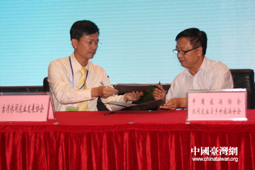 中國旅游協(xié)會休閑農(nóng)業(yè)與鄉(xiāng)村旅游分會會長甘士明與臺灣休閑農(nóng)業(yè)發(fā)展協(xié)會秘書長游文宏簽訂備忘錄。(中國臺灣網(wǎng) 郭瑩瑩 攝)