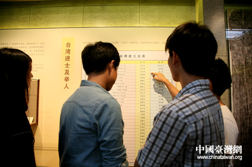 16日下午,來自清華大學(xué)、北京大學(xué)、中國人民大學(xué)、中央民族大學(xué)等八所高校的150多名臺(tái)灣學(xué)生參觀了位于前門附近的臺(tái)灣會(huì)館。圖為臺(tái)生們?cè)谂_(tái)灣進(jìn)士及舉人名表上尋找同姓進(jìn)士。(中國臺(tái)灣網(wǎng) 普燕攝)