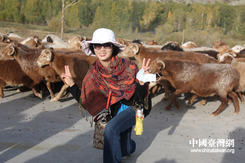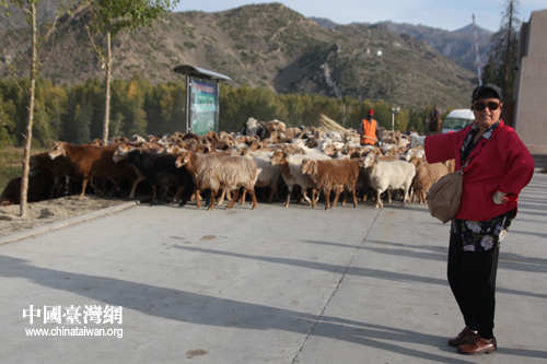 臺灣中南部鄉鎮里長新疆兵團參訪團成員與牧區羊群合影留念。(中國臺灣網 高斯斯 攝)