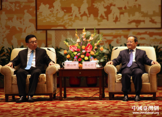 9月22日晚,中共江西省委副書記、江西省長鹿心社在南昌會見了全國臺灣同胞投資企業聯誼會會長郭山輝等前來參加2012“贛臺會”的臺灣嘉賓。(中國臺灣網 王思羽 攝)