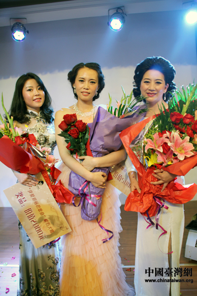“我愛鄧麗君歌曲模仿大賽”三甲合影,左起杜佳瑤、潘蓬、于紅萍。(中國臺灣網 吳怡 攝)