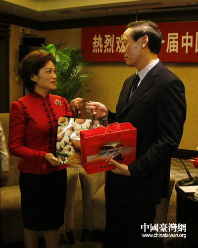 第十屆農交會臺灣代表團贈送農業部副部長余欣榮阿里山茶葉。(中國臺灣網 郭瑩瑩 攝)