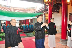 新北市長朱立倫(中)昨天上午前往板橋大觀書社,穿上祭典禮服,擔任新北市至圣先師孔子誕辰釋奠典禮主祭官,儀式莊嚴肅穆。圖片來源:臺灣《中國時報》