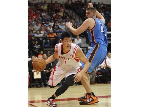 林書豪在熱身賽首戰(zhàn)面對雷霆的比賽中上場20分鐘,投3中1繳出3分6助攻3抄截的成績。圖片來自臺媒