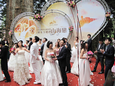 中國臺(tái)灣網(wǎng)10月12日消息 據(jù)臺(tái)灣“今日新聞網(wǎng)”報(bào)道,為推廣臺(tái)灣訂婚主題游程,臺(tái)當(dāng)局“交通部觀光局”籌劃的“旅行臺(tái)灣,就是現(xiàn)在”浪漫系列活動(dòng),于今日推出“2012阿里山新印象—神木下婚禮山海戀”,此次將有13對(duì)新人在阿里山千年神木的見證下互許神圣的誓言,完成終身大事,其中有3對(duì)新人是來自山東和江蘇的佳偶。