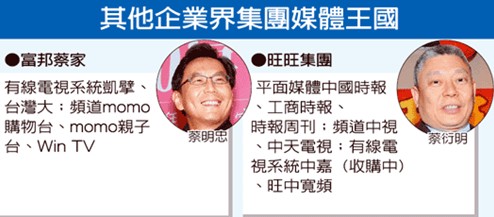 攤開兩大集團媒體布局,富邦蔡明忠與臺灣大蔡明興擁有全臺最大有線電視系統臺凱擘、有線電視頻道、電信固網等;蔡衍明則獨缺系統臺,平面媒體與有線、無線電視頻道一應俱全。