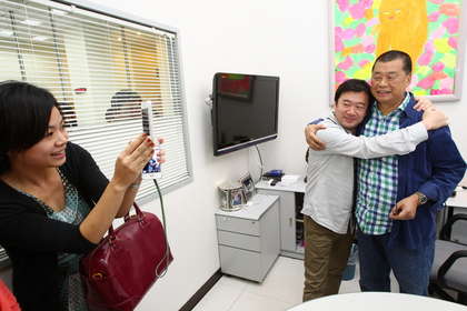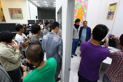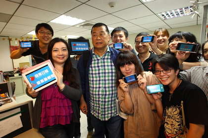 黎智英退出臺灣,下班前與員工合照簽名,在辦公室里造成騷動。圖片來源:臺灣媒體