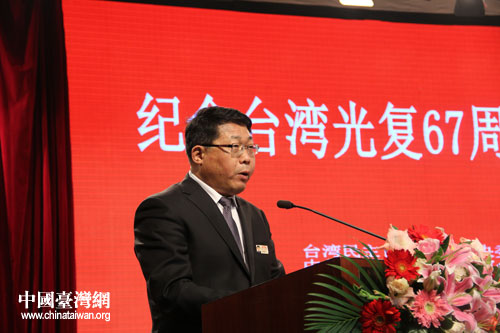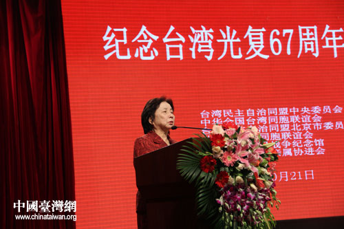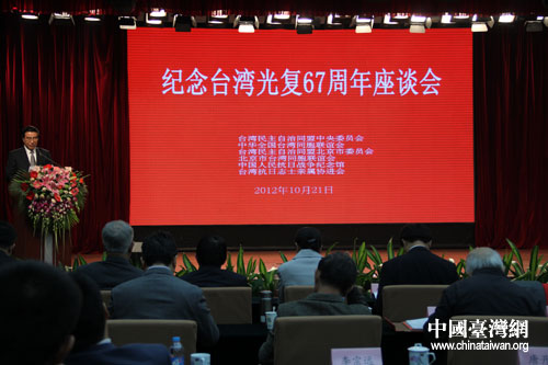 中國臺灣網10月21日北京消息 10月21日,由臺盟中央、全國臺聯及北京市臺盟、臺聯,中國人民抗日戰爭紀念館、臺灣抗日志士親屬協進會聯合舉辦的“紀念臺灣光復67周年座談會”在中國人民抗日戰爭紀念館舉行。