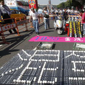 今天上午勞工們在臺北凱達格蘭大道(馬英九辦公室所在街區)前舉辦行記者會,諷刺當局所承諾的有感經濟難以兌現,只會拿出凍漲基本工資等飲鴆止渴的政策,記者會中,勞工代表還用雞蛋在地上排出“混蛋”2字,并預告游行當天,將用雞蛋蛋洗馬英九辦公室,表達不滿情緒。