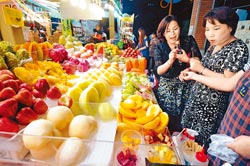 臺灣水果質(zhì)量佳,是不少觀光客赴臺必吃美味,圖為兩名大陸游客在攤位前試吃,頻頻稱贊臺灣水果好甜。圖片來源:臺灣《中國時報》