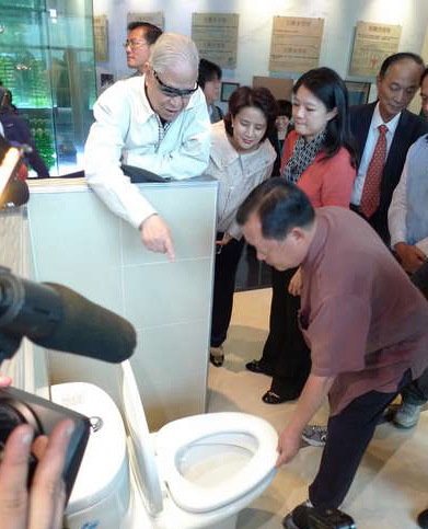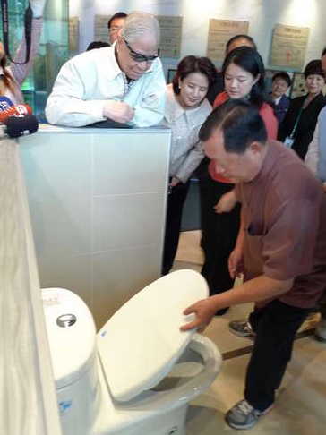 參訪冠軍磁磚綠概念館,當李登輝在展示區看到一個馬桶時,就對一旁劉政鴻說,“掀起來看看!”劉政鴻立刻上前彎腰把馬桶蓋掀開,讓其看仔細。(中國臺灣網 焦源源)