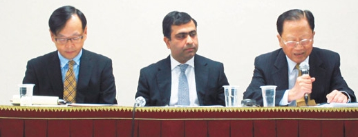 ING安泰投信董事長(zhǎng)鄒鴻圖(右起)、總經(jīng)理毛昱文、執(zhí)行副總賴峰彰昨天出面,為前基金經(jīng)理人不當(dāng)操作盈正案致歉,安泰投信破天荒賠償臺(tái)當(dāng)局基金與三檔共同基金約2.5億元(新臺(tái)幣,下同)虧損。圖片來(lái)源:臺(tái)灣《聯(lián)合報(bào)》