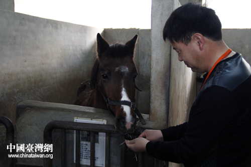 代表團成員體驗給馬匹喂料 (中國臺灣網 于斯文 攝)