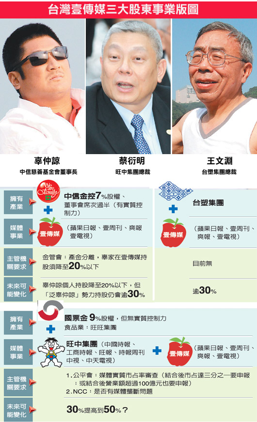 臺當(dāng)局“金管會”要求辜仲諒,投資壹傳媒,持股必須低于20%、完全不能涉入壹傳媒的經(jīng)營、也不能擔(dān)任買家代表人與壹傳媒大股東黎智英簽約。