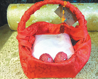 連惠心喜獲愛女,日前低調寄發簡訊通知好友,并寄發彌月油飯。彌月油飯里頭是兩個紅蛋、一盒雞腿油飯,外面還用紅綢包覆,掛上吉祥玉佩,非常精致。圖片來源:臺灣《聯合報》