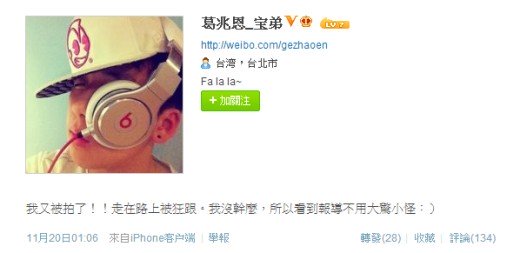 就在前天(19日)晚間一直到第二天凌晨,寶弟又再一次被平面媒體直擊出沒在臺北市東區(qū)的夜店,他似乎也發(fā)現(xiàn)自己被跟拍,于20日的凌晨1:06在微博留言道:“我又被拍了!!走在路上被狂跟。我沒干么,所以看到報道不用大驚小怪。”父親生病,他卻還有心情上夜店?而且重點是未成年的他怎么能在外頭搞到快1點還在玩樂,實在叫人傻眼。(中國臺灣網(wǎng) 周劍)