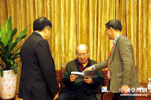 11月23日,中國國民黨榮譽主席吳伯雄在梅州會見蕉嶺籍大陸學者徐博東等,圖為徐博東、黃志平向吳伯雄贈書(中國臺灣網(wǎng)記者 蕪同 攝)