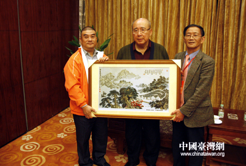 11月23日,中國國民黨榮譽主席吳伯雄在梅州會見蕉嶺籍大陸學者徐博東等,徐博東、黃文獻向吳伯雄贈送客家文創(chuàng)紀念品(中國臺灣網(wǎng)記者 蕪同 攝)