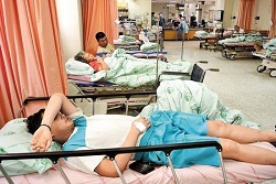 醫(yī)院急診室里躺滿了身體不適等待就醫(yī)的師生。(圖片來源:臺(tái)灣《中國(guó)時(shí)報(bào)》)