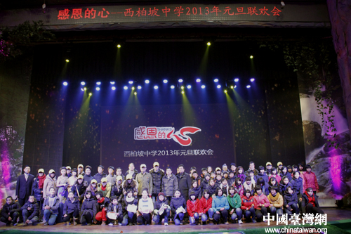 在西柏坡中學“感恩的心——元旦聯歡會”結束后,頂新基金會理事長騰鴻年在有關領導陪同下上臺與演員合影(中國臺灣網記者 蕪同 攝)