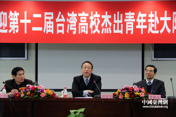 鄭建邦在會見中對參訪團的到來表示了歡迎,他說,剛剛過去的2012年,在兩岸關系發展進程上具有特殊重要的意義。年初臺灣地區兩項重要選舉結果表明,兩岸關系和平發展符合兩岸同胞的共同愿望,符合中華民族的整體利益,符合時代發展進步的潮流。只要兩岸雙方沿著和平發展的正確道路堅定走下去,就一定能進一步開創兩岸關系和平發展的新局面,也勢必給兩岸的青年才俊提供更為寬闊的展示才華的舞臺。
