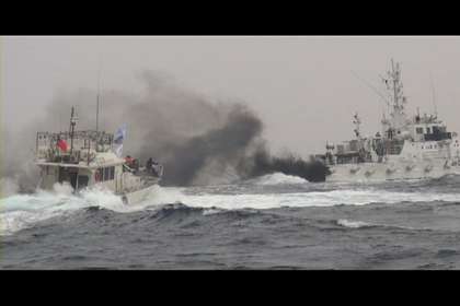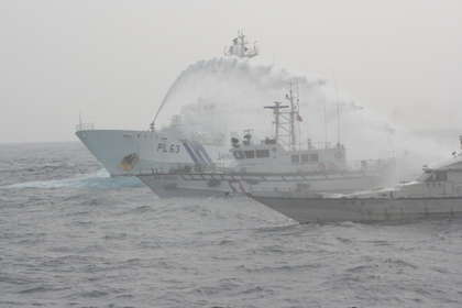 中國臺灣網1月24日消息 據臺灣媒體報道,今天凌晨1時46分,臺灣保釣人士帶著一尊大甲媽祖神像,搭乘“全家福”號漁船從新北市深澳漁港出發,10時32分進逼釣魚島28海里處時,遭日艦噴水柱,甚至排放黑煙、造浪等方式驅趕,臺灣艦艇上前阻擋,也以水柱反擊。