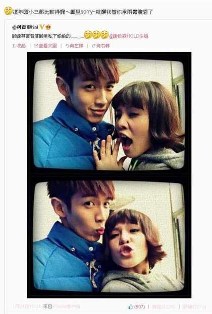 24日柯震東就在微博發了和Hold住姐正常版的合照。圖自臺媒